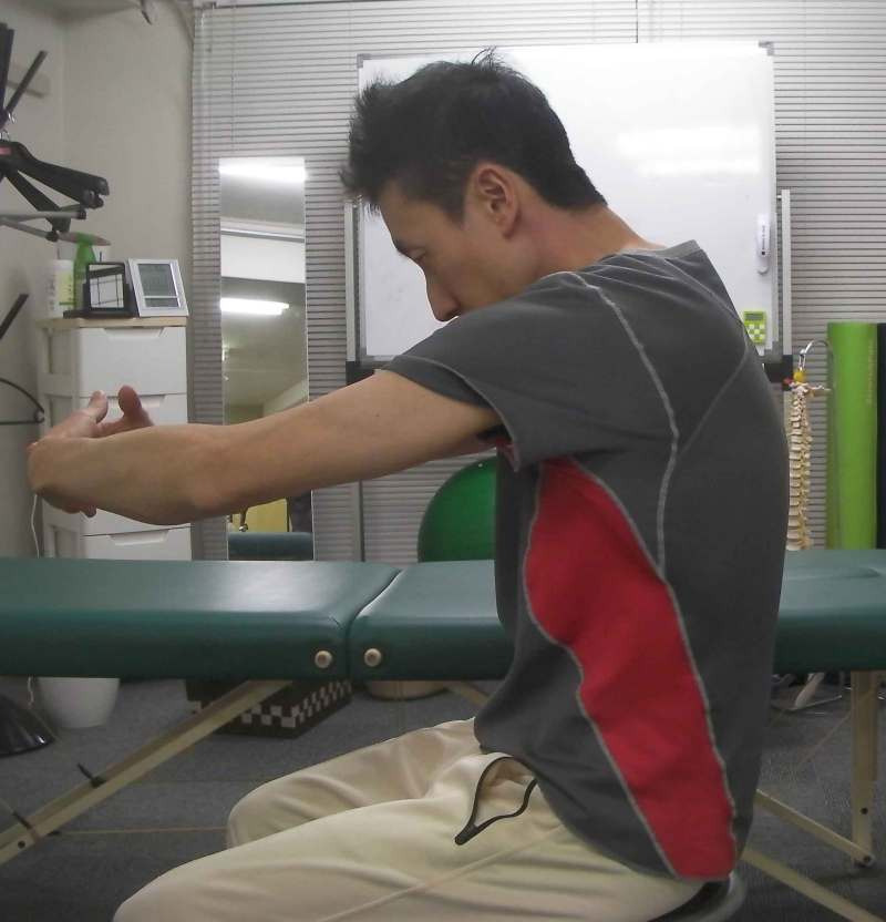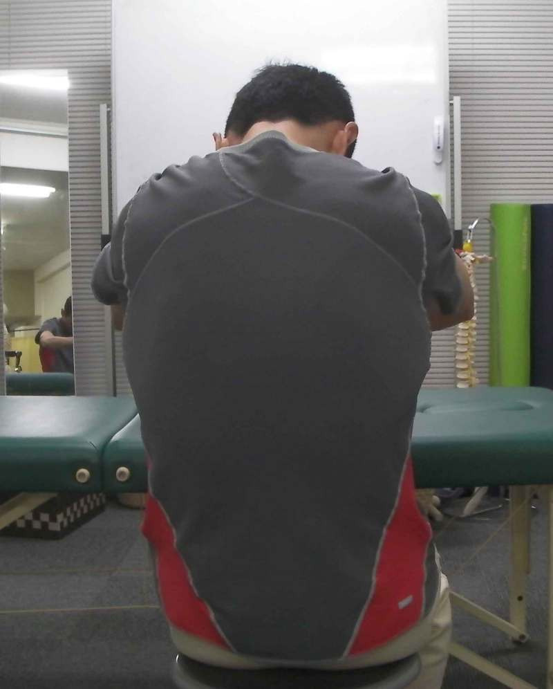 この姿勢だと胸が縮まっていますので、呼吸をすると背中側が膨らみやすくなっています。