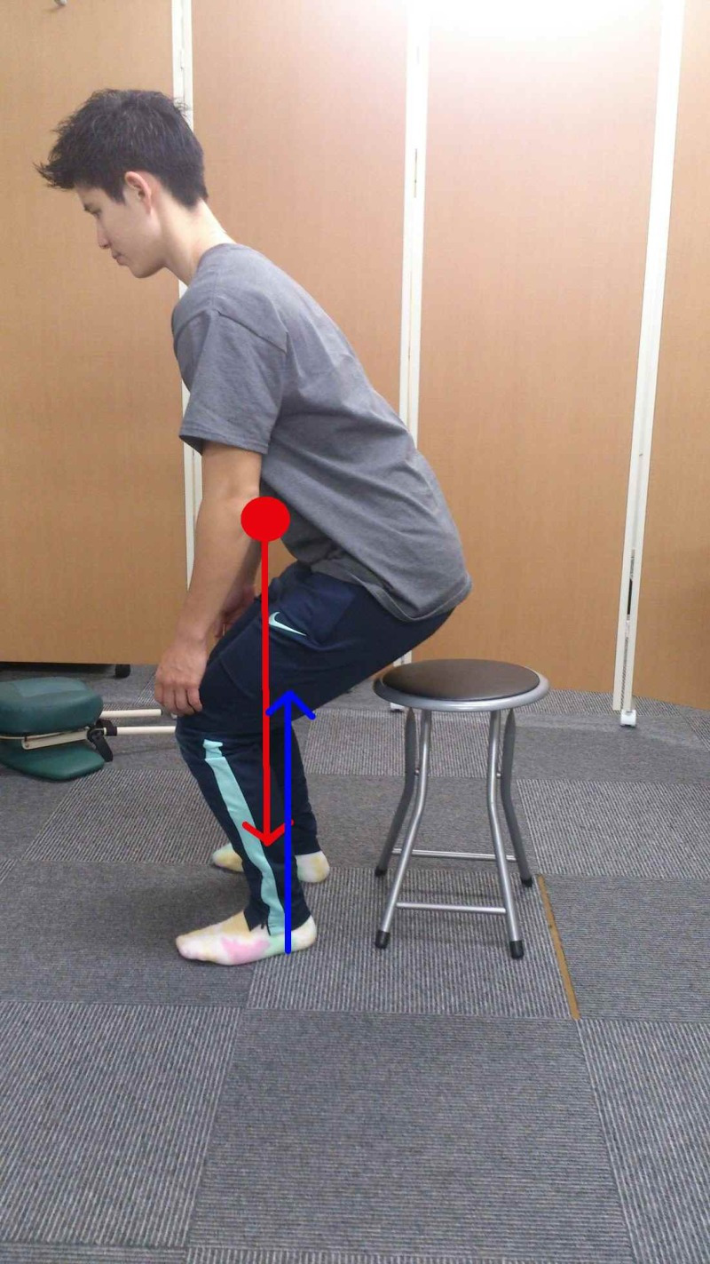 このまま立ち上がろうとしますと、立ち上がり時に重心点が支持基底面である「両足のスペース」に入る前に踏ん張ってしまうので