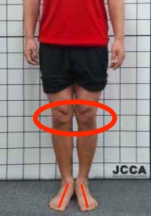 これは骨の形の問題です、詳しくは後程説明いたしますが…ここで覚えておいて欲しいのは、正常な骨格の方だと膝が正面でつま先はやや外側を向くのが自然なのです。