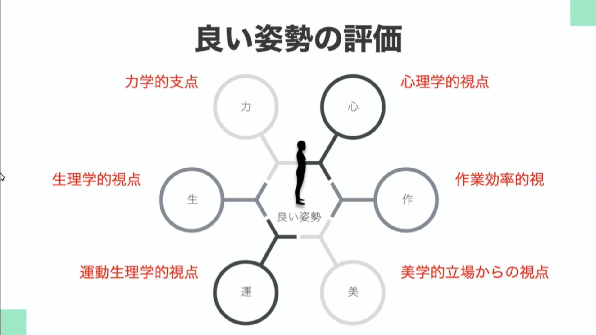 その上で、なおかつ良い姿勢の評価基準として、次の6つの視点から見る事が重要となります。