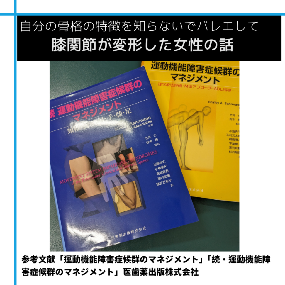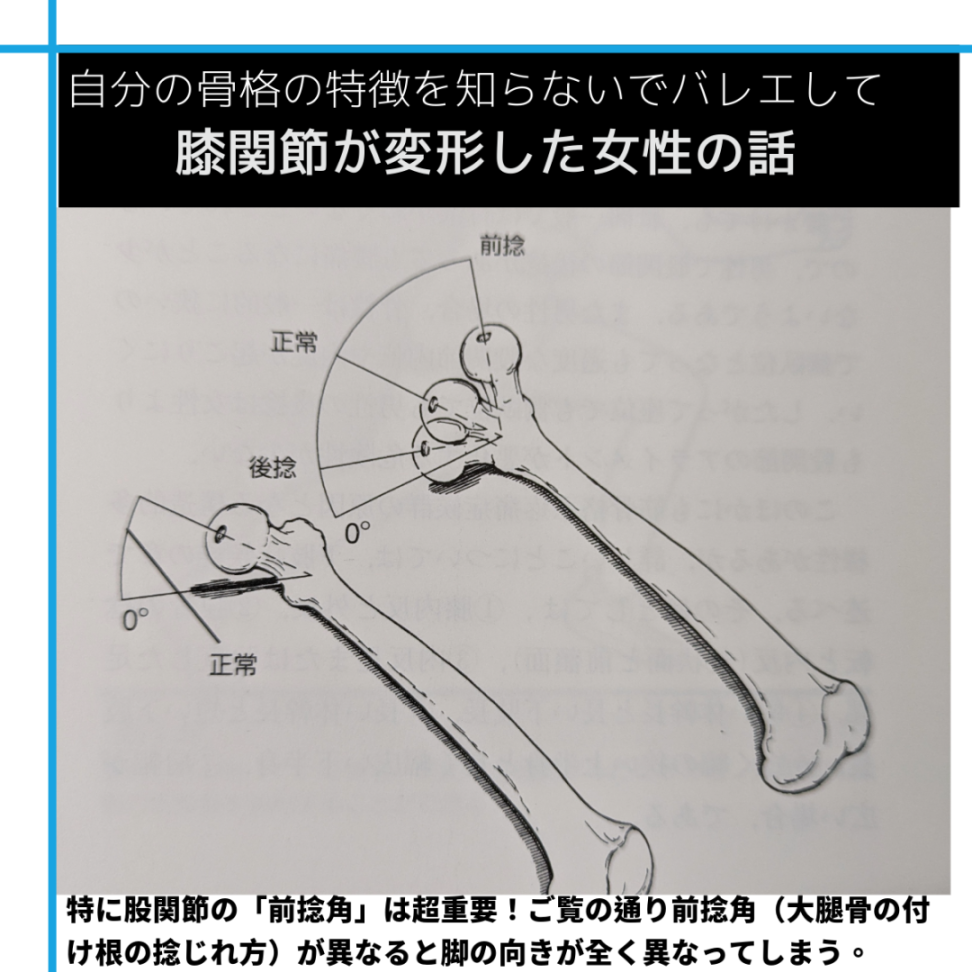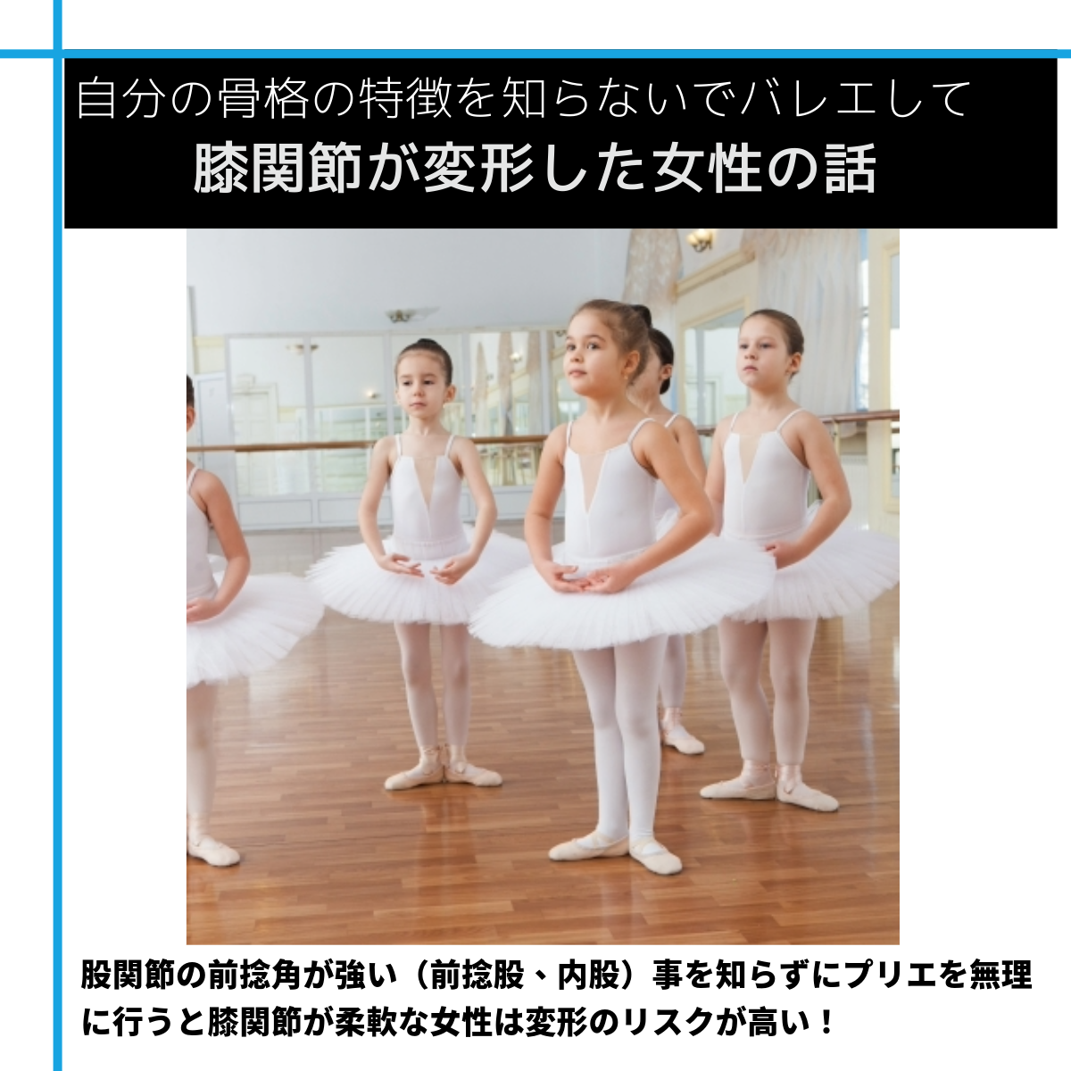 しかし、そんな事は全く知らずこの女性は「クラッシックバレエ」を小さい頃から習っていて、プリエの一番を長期間実施していた事が原因で膝関節が過度に外旋するように変形してしまいました。