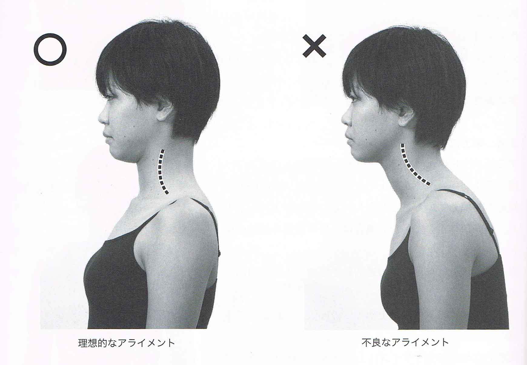 で、首に負担の少ない姿勢、いわゆる良い姿勢は横から見た時に「肩の真ん中」と「耳の穴」の位置が垂直線上に位置する姿勢が良い姿勢と言われています。