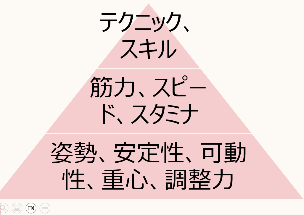 厳密には「コアコンディショニング」と呼ばれるもので、このパフォーマンスピラミッドの最下層を整える事に特化したものなんです。