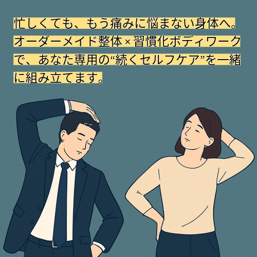 おくがわ整体院は、あなたの身体に合わせたオーダーメイドの整体とボディーワークで、効率的なセルフケア習慣を一緒に築きます。