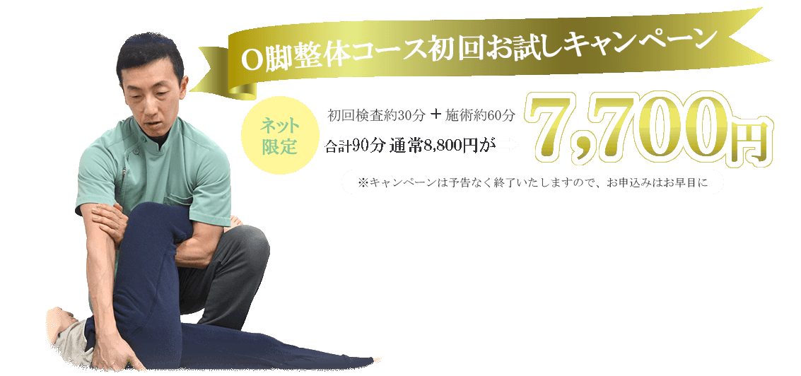 そんな方の為に令和4年4月30日まで以下の特設サイトより「O脚整体」を初回ご予約いただいたお客様は